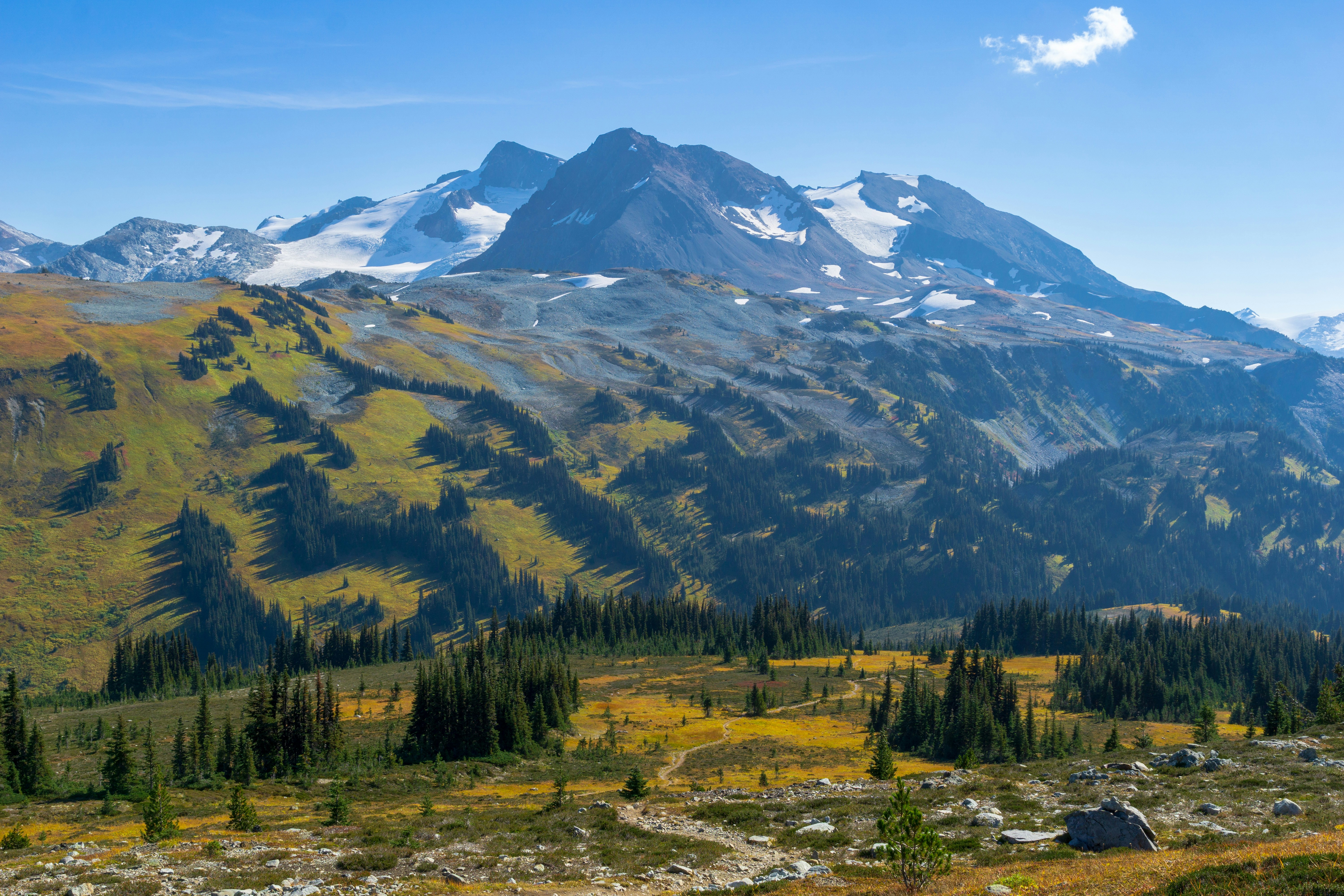 a view of a mountain range with trees in the foreground